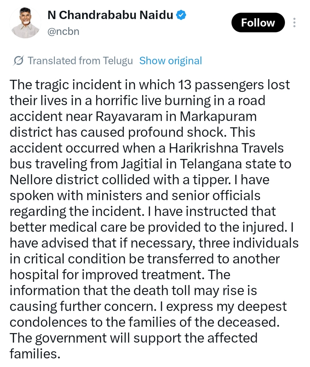 हादसे के तुरंत बाद राष्ट्रपति द्रौपदी मुर्मू, प्रधानमंत्री नरेंद्र मोदी और मुख्यमंत्री चंद्रबाबू नायडू ने ट्विटर पर शोक व्यक्त किया। प्रधानमंत्री कार्यालय ने मुआवजे का ऐलान भी कर दिया है। लेकिन क्या चंद लाख रुपए उन मांओं की गोद भर पाएंगे जिनके बेटे इस आग में स्वाहा हो गए? क्या ये संवेदनाएं उस सिस्टम को बदलेंगी जो भ्रष्टाचार के चलते अनफिट बसों को परमिट दे देता है?